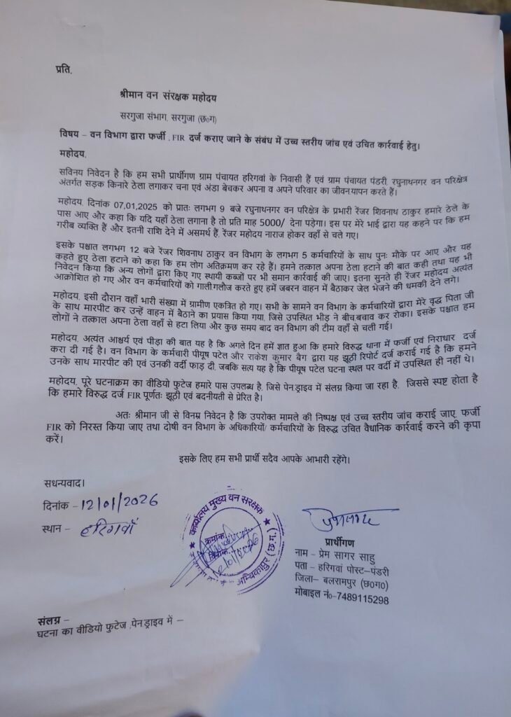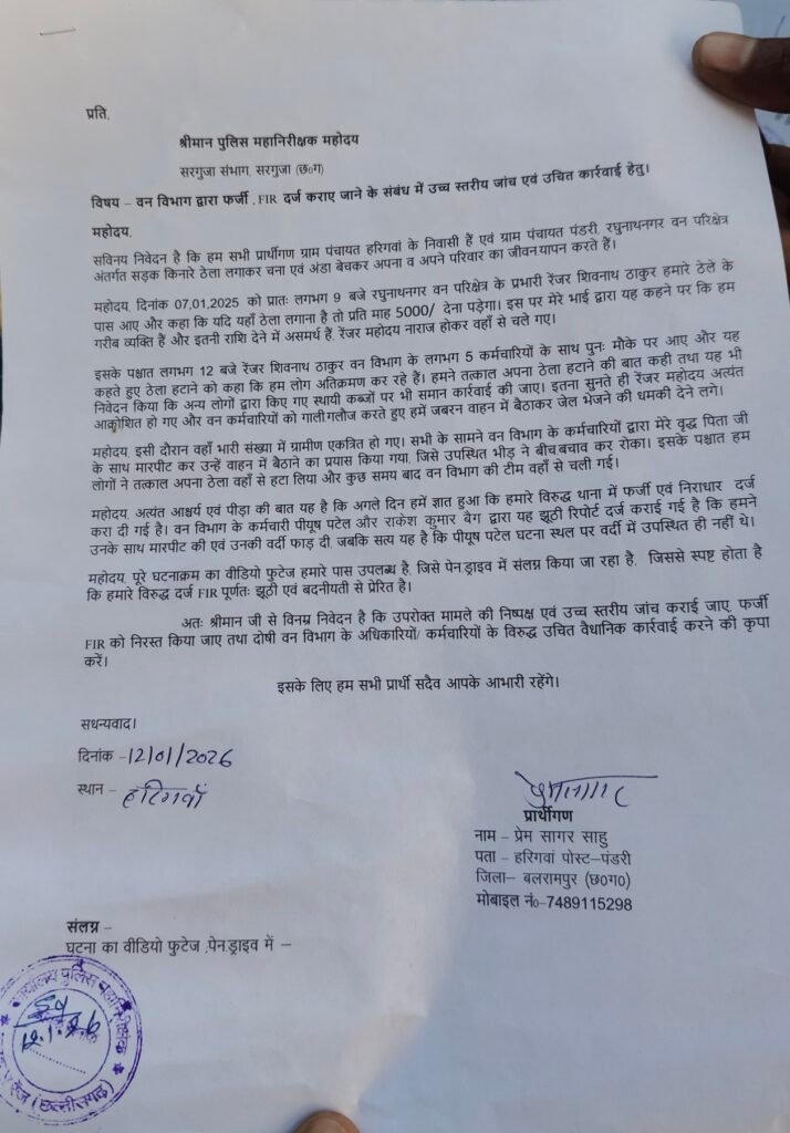 बलरामपुर जिले के रघुनाथनगर वन परिक्षेत्र अंतर्गत ग्राम पण्डरी से वन विभाग को लेकर गंभीर आरोप सामने आए हैं। ग्रामीणों ने प्रभारी रेंजर शिवनाथ ठाकुर पर रिश्वत मांगने, धमकी देने, मारपीट कराने और बाद में फर्जी FIR दर्ज कराने जैसे संगीन आरोप लगाए हैं। मामले को लेकर ग्रामीणों ने सरगुजा रेंज के IG और मुख्य वन संरक्षक से लिखित शिकायत करते हुए पूरे प्रकरण की उच्च स्तरीय एवं निष्पक्ष जांच की मांग की है।