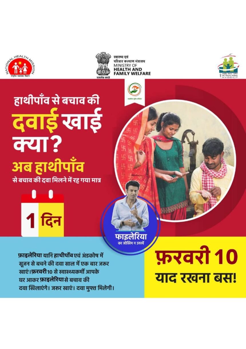 अंबिकापुर.-सरगुजा जिले को फाइलेरिया जैसी गंभीर बीमारी से पूरी तरह मुक्त करने के उद्देश्य से स्वास्थ्य विभाग द्वारा 10 फरवरी 2026 से 25 फरवरी 2026 तक फाइलेरिया उन्मूलन महाअभियान चलाया जाएगा। इस विशेष अभियान के तहत जिले के शहरी और ग्रामीण क्षेत्रों में लोगों को फाइलेरिया रोधी दवाइयाँ खिलाई जाएंगी।