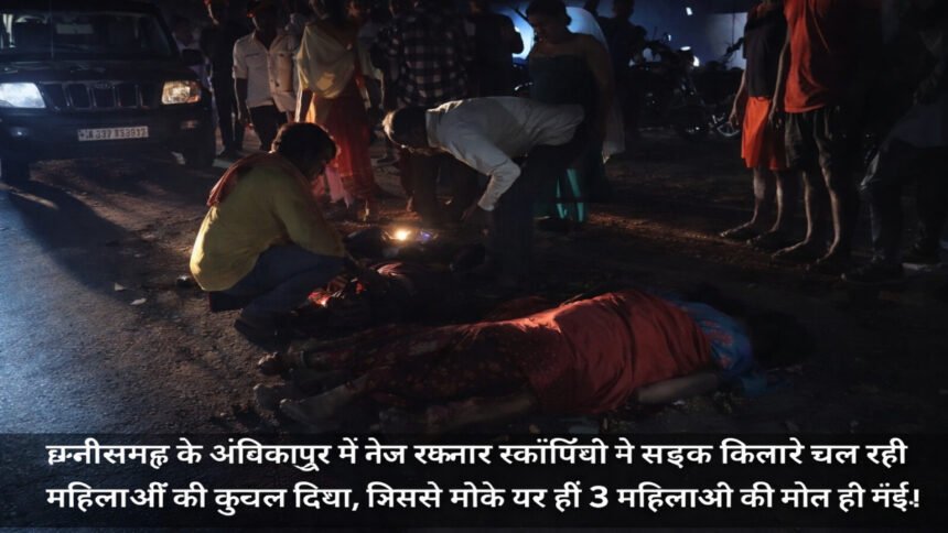अंबिकापुर | 06 अप्रैल, 2026 छत्तीसगढ़ के सरगुजा जिले में रविवार की रात एक भीषण सड़क हादसे ने पूरे इलाके को दहला दिया। NH-130 ‘ पर स्थित मणिपुर थाना क्षेत्र के भिठ्ठीकला गांव के पास एक तेज रफ्तार स्कॉर्पियो ने सड़क पार कर रही चार महिलाओं को बुरी तरह कुचल दिया। हादसे की भयावहता का अंदाजा इसी बात से लगाया जा सकता है कि तीन महिलाओं ने मौके पर ही दम तोड़ दिया, जबकि एक अन्य महिला गंभीर रूप से घायल है।