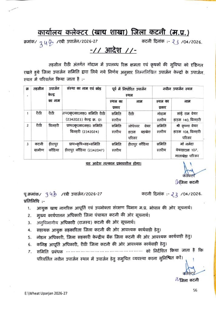 शनिवार दोपहर करीब 3 बजे आदेश जारी करते हुए रीठी में ही खरीदी केंद्र स्थापित करने का निर्णय लिया गया है।