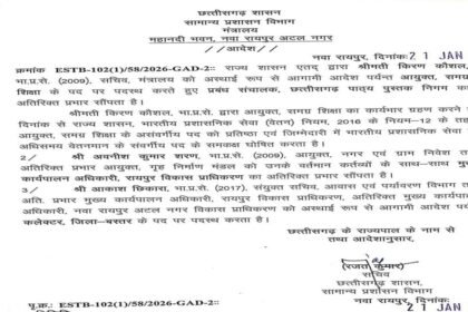 CG BREAKING : छत्तीसगढ़ में प्रशासनिक फेरबदल, तीन IAS अधिकारियों के तबादले के आदेश जारी
