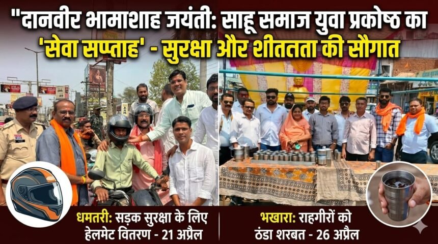 धमतरी: जिला साहू समाज धमतरी के युवा प्रकोष्ठ द्वारा दानवीर भामाशाह की जयंती को ‘सेवा सप्ताह’ के रूप में मनाते हुए मानवता और सामाजिक सरोकार की अनूठी मिसाल पेश की गई। इस दौरान जहाँ धमतरी शहर में सुरक्षा के प्रति जागरूकता फैलाई गई, वहीं भखारा में तपती गर्मी से राहत दिलाने हेतु सेवा शिविर का आयोजन किया गया।